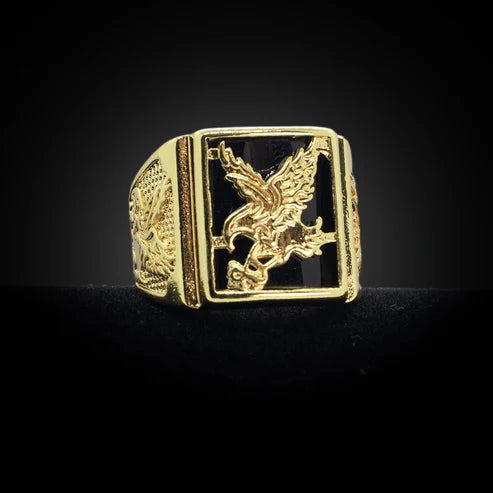 Um anel que exala poder e presença. Com o desenho detalhado de uma águia, símbolo de força, coragem e liberdade, esta joia é perfeita para homens que valorizam acessórios com significado. A peça é robusta e esculpida para se destacar no dedo, adicionando um toque de mistério e personalidade ao seu estilo.