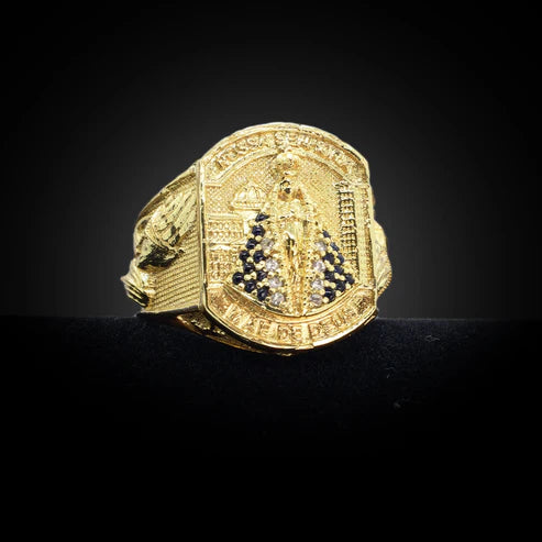 Símbolo de proteção e devoção. Este anel masculino de Nossa Senhora é uma joia para quem valoriza a fé. O design detalhado da santa em sua parte superior é um lembrete de proteção e espiritualidade. É uma peça robusta e elegante, perfeita para ser usada diariamente, unindo estilo e significado.