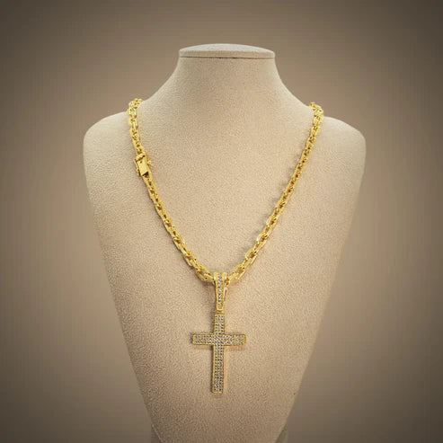 Feito para os que valorizam fé e estilo. Este Colar Corrente Cadeado de 6mm é robusto, com elos ovais que se conectam, oferecendo um visual clássico e forte. O pingente, uma Cruz totalmente cravejada com zircônias, brilha intensamente, tornando-o uma peça notável e cheia de significado. É a combinação perfeita de fé e moda.