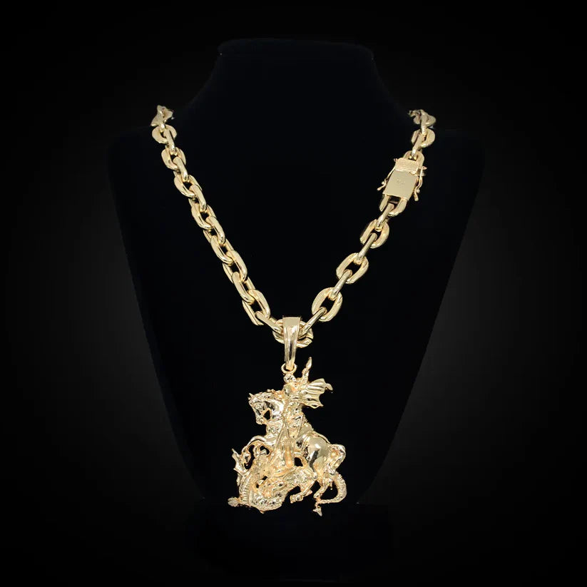 Carregue um símbolo de fé e proteção com esta joia espetacular. A corrente Cadeado de 13mm, robusta e banhada a ouro 18k, serve de base para um magnífico pingente de São Jorge Guerreiro. Com um design vazado e rico em detalhes, a peça retrata a icônica imagem do santo vencendo o dragão. É um acessório de grande presença e significado, perfeito para quem busca expressar sua devoção com uma joia de acabamento impecável.