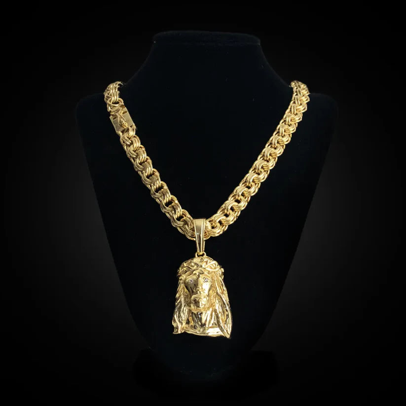 A união perfeita entre a fé e o brilho. Este conjunto apresenta a imponente corrente de elos triplos de 13mm, banhada a ouro 18k, combinada com um pingente retangular da face de Cristo. O grande diferencial é a moldura e o passador totalmente cravejados com zircônias de alta qualidade, que proporcionam um brilho intenso e luxuoso. Uma joia que equilibra devoção e ostentação para um estilo marcante e cheio de personalidade.