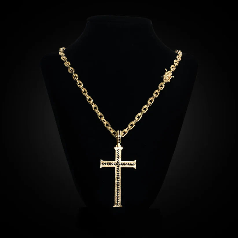 Uma joia de impacto para quem não tem medo de se destacar. A corrente robusta de elos de cadeado traz uma atitude moderna e poderosa, servindo como a base perfeita para o pingente de cruz cravejado com zircônias pretas. Esse acessório é ideal para criar um visual sofisticado e marcante, unindo a força do design com a elegância do brilho discreto das pedras.