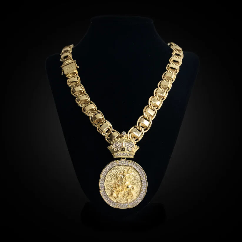 Exclusividade e luxo definem esta joia. A corrente Exótica de 15mm possui um design único de elos trabalhados, garantindo um visual imponente e diferenciado. O destaque absoluto é o medalhão cravejado com zircônias, que apresenta São Jorge em alto relevo e uma magnífica coroa no topo, também cravejada. Esta peça é um verdadeiro símbolo de poder, nobreza e ostentação, ideal para quem deseja se destacar com uma joia inesquecível.