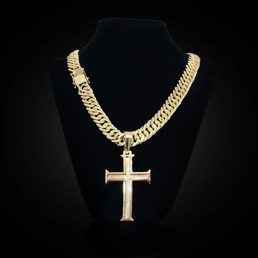 Para quem não tem medo de ousar, esta corrente Grumet de 13mm é a definição de presença. Seus elos largos e robustos, com um banho de ouro 18k de alta qualidade, garantem um visual impactante e luxuoso. O conjunto é complementado por um pingente de cruz com um design trabalhado e texturizado, que adiciona um toque de sofisticação e simbolismo. Com fecho de gaveta reforçado, esta é a joia perfeita para afirmar seu estilo com força e fé.