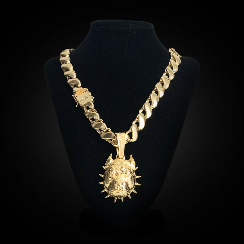 Para quem quer demonstrar sua personalidade forte e marcante. A corrente Modelo S de 13mm oferece uma presença imponente e moderna. O pingente, no formato da cabeça de um Pitbull com detalhes em zircônias, é uma peça ousada e cheia de atitude, representando lealdade, força e estilo.