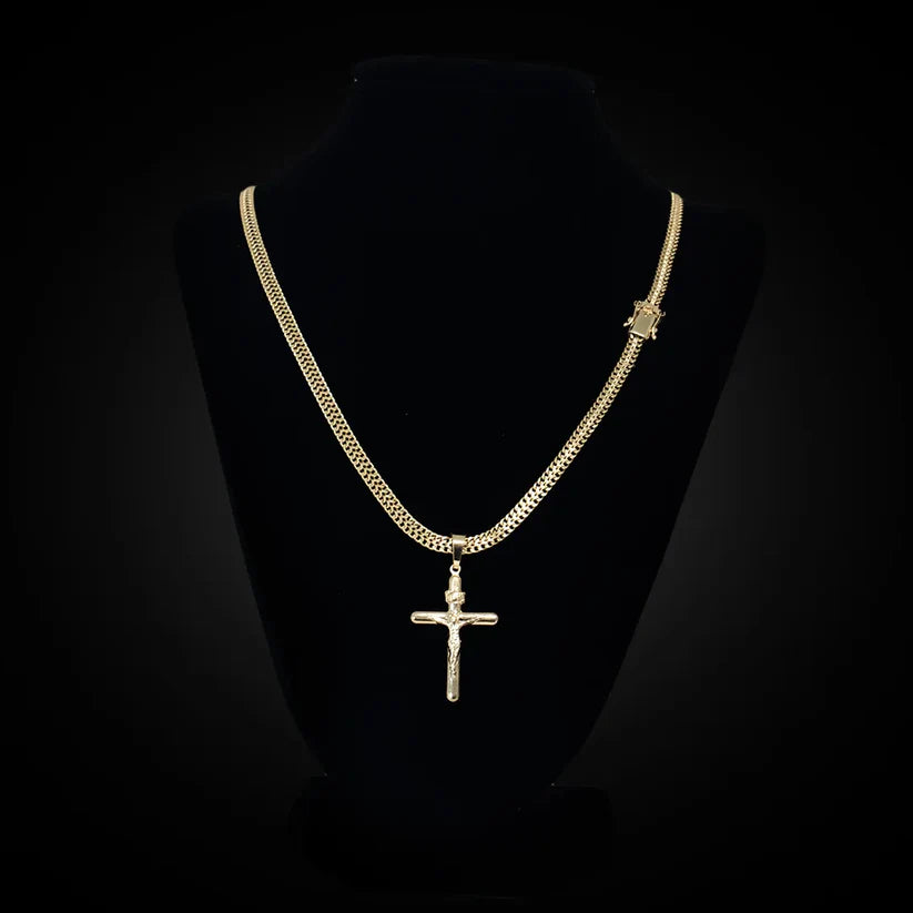 Expresse sua fé com sofisticação. Essa corrente combina o clássico design Sadusa, conhecido por sua maleabilidade e brilho, com um pingente de cruz detalhado com a figura de Jesus Cristo. As pedras cravejadas no pingente adicionam um toque de luz e elegância, tornando a peça ainda mais especial. É o acessório perfeito para quem busca uma joia com significado, estilo e durabilidade.